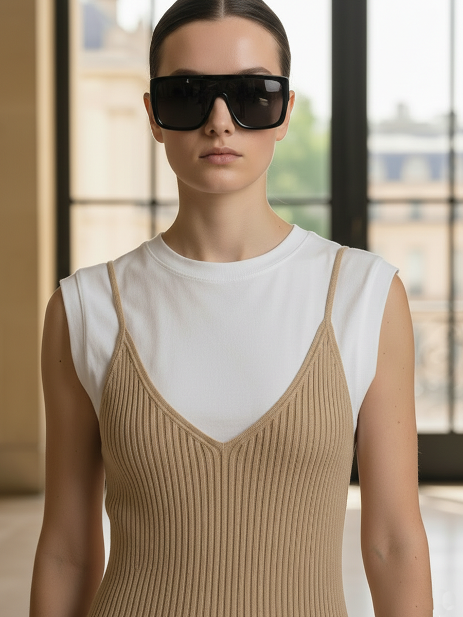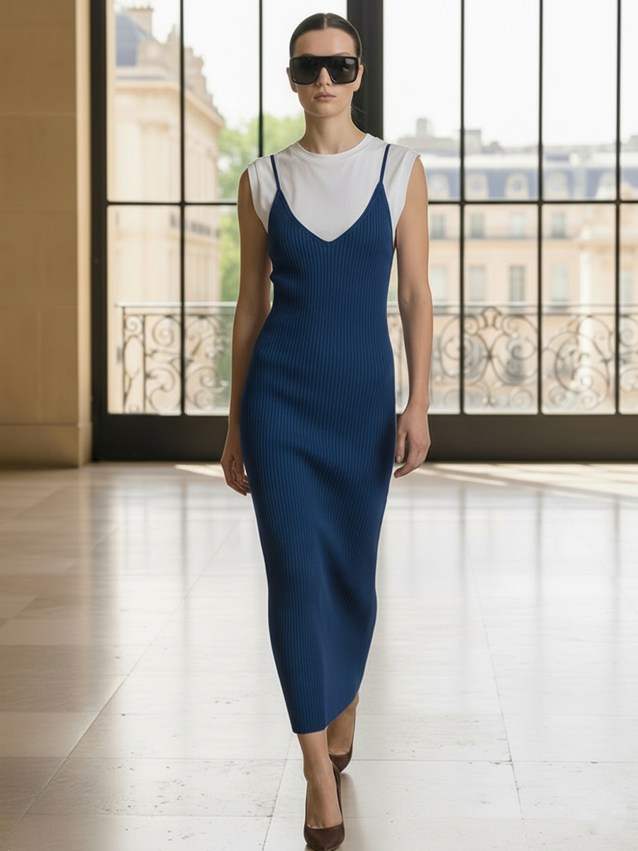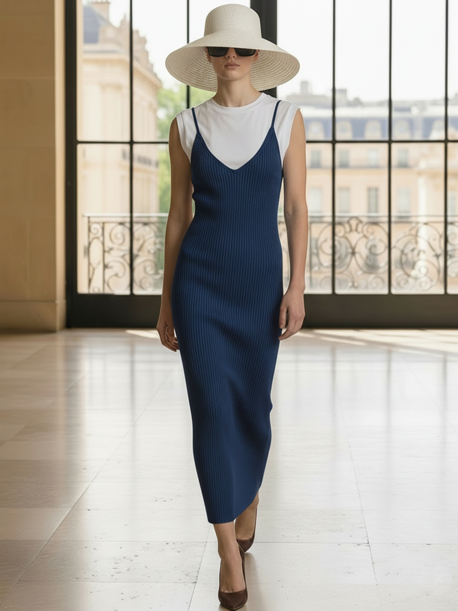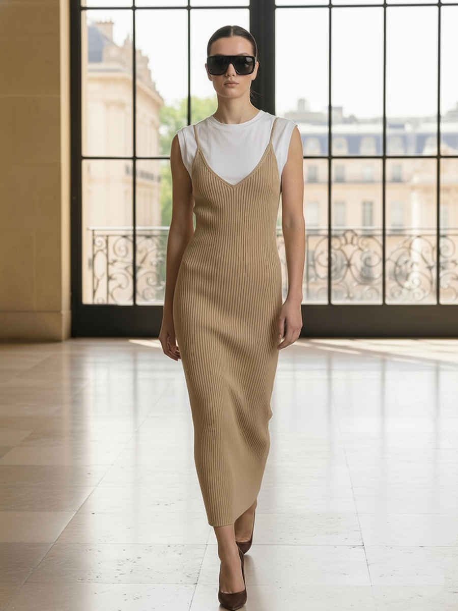 This sleeveless knitted camisole maxi dress offers a timeless, minimalist silhouette with an included inner tank top for added coverage and shaping. Crafted from a soft, stretch knit, the dress drapes smoothly over the body to create an understated, elegant look that works well for everyday wear or dressed-up occasions.