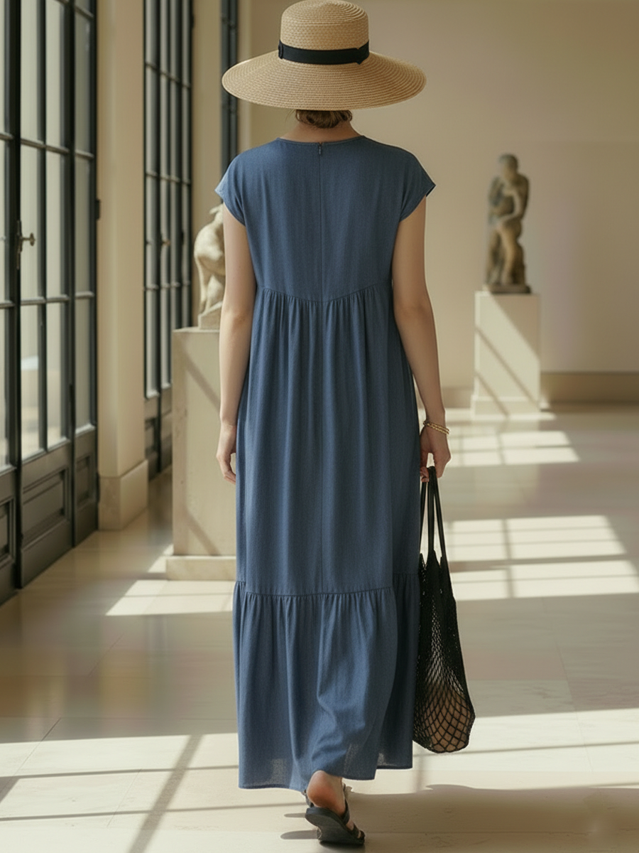 Women's High-end Minimalist Cotton-linen Blend Round Neck Short-sleeved Maxi Dress ZMZ1450B6K