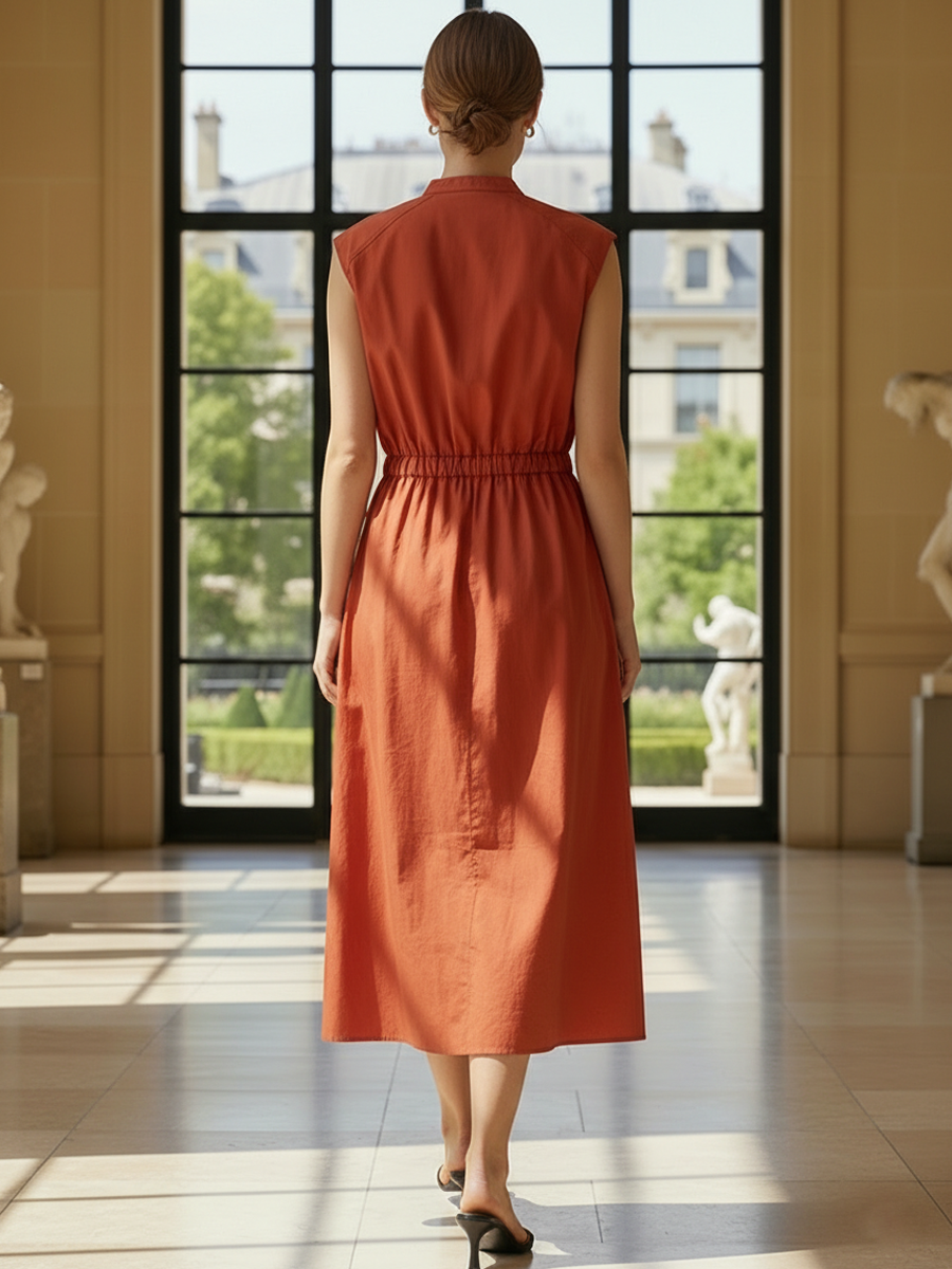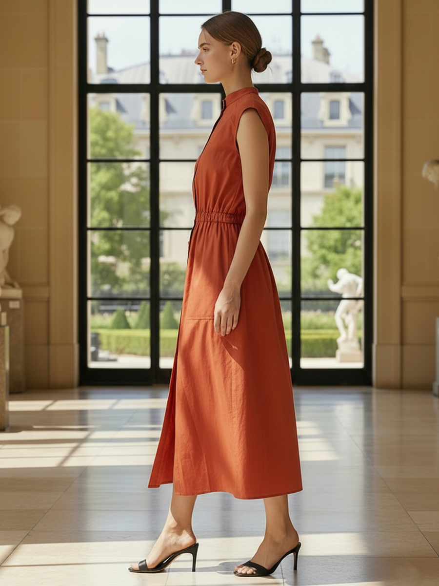 This sleeveless maxi dress combines vintage-inspired commuter styling with everyday comfort. Made primarily from breathable cotton, it features an elasticized waist that creates a gentle, flattering silhouette while allowing freedom of movement. The long, flowing skirt gives a timeless, elegant look suitable for work, weekend errands, or casual outings.