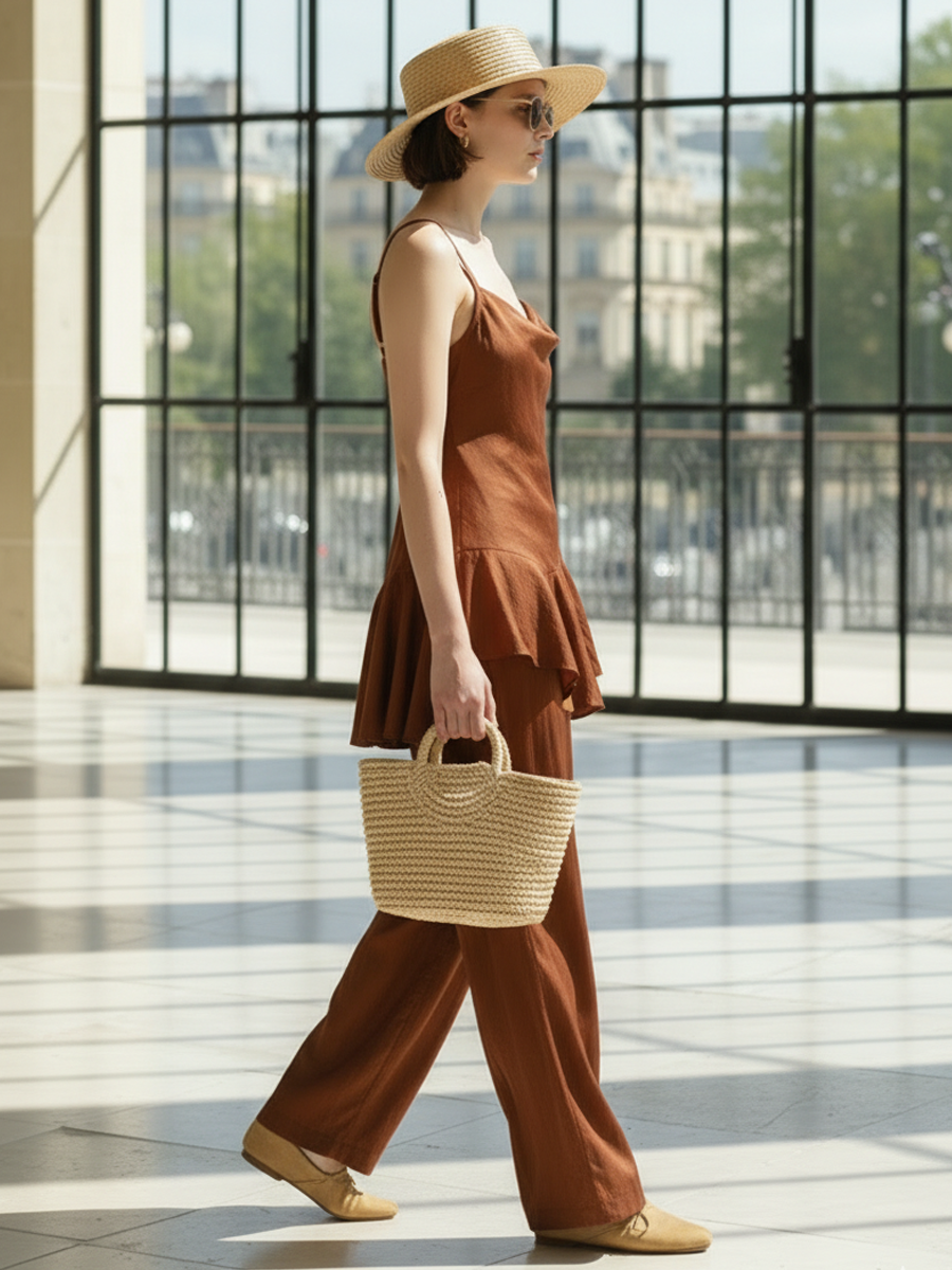 ·Silhouette: Minimal, tailored shapes—sleek camisole with delicate straps and a refined neckline paired with high‑rise, straight or slightly wide trousers for a balanced silhouette.