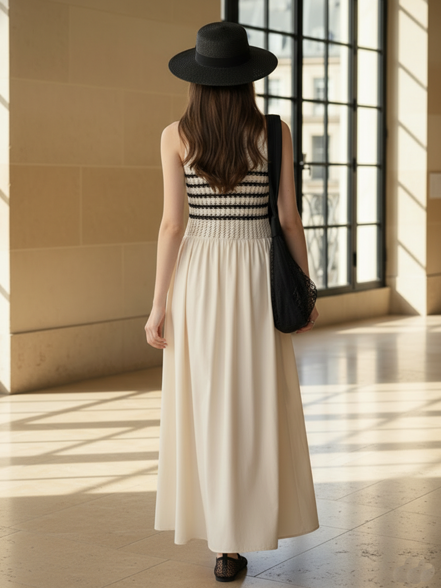 Women's Casual Old-fashioned Knitted Patchwork Pure Cotton Sleeveless Slim Fit Maxi Dress ZMZ2411B0K