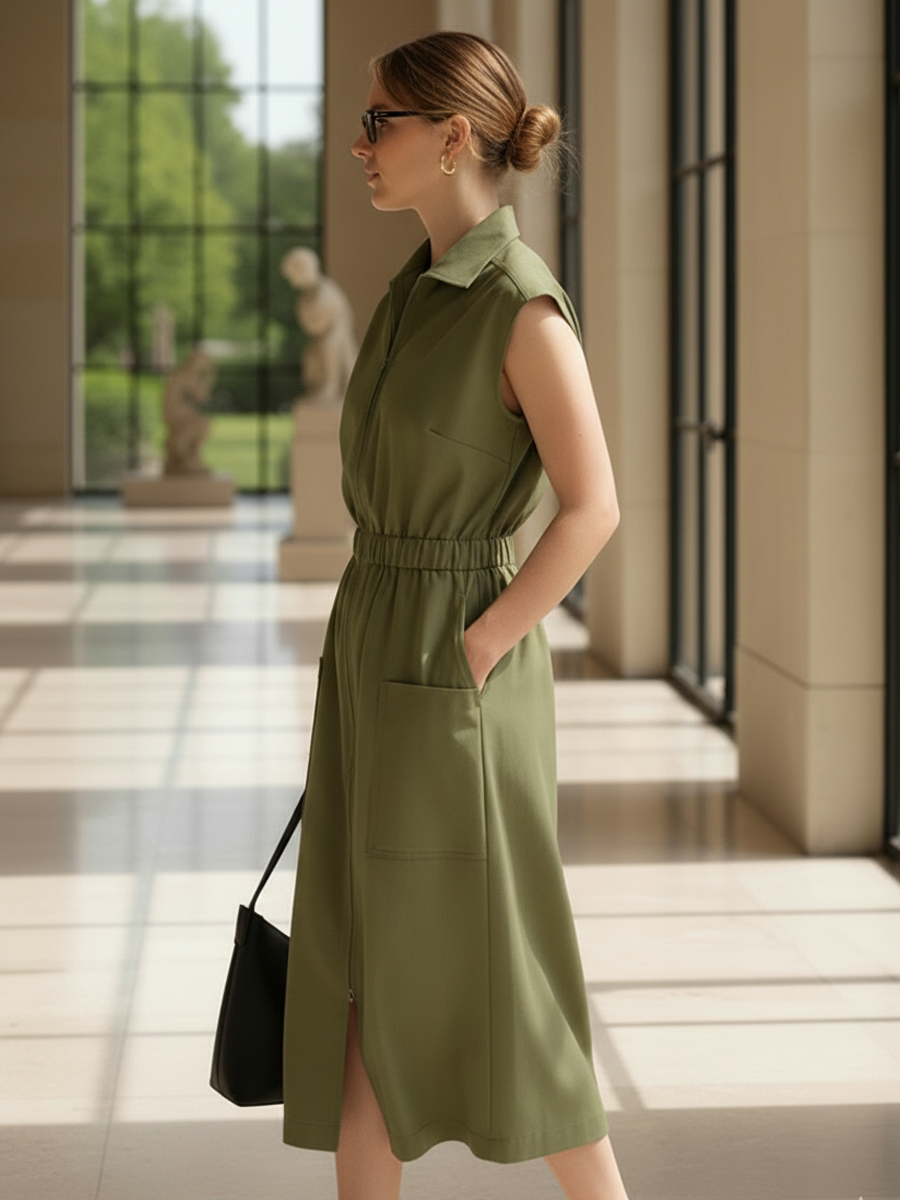 Women's Casual, Vintage Style, Pure Cotton, Elastic Waist, Zipper, Sleeveless Midi Dress ZMZ1136B9K