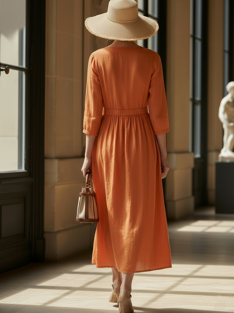 This maxi dress is crafted from a breathable cotton-linen blend for a soft, textured drape that feels light and comfortable all day. The short sleeves and ankle-length hem create an elegant, easy silhouette, while the embroidered waist detail adds a refined, feminine focal point. Ideal for warm-weather wear or layered looks in cooler months, this dress balances relaxed comfort with subtle tailored shaping.