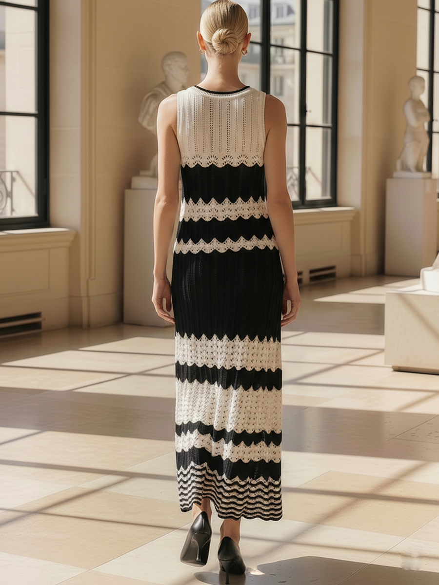 This sleeveless, round-neck knitted maxi dress combines a streamlined, body-conscious fit with comfortable stretch for everyday wear and special occasions. The clean silhouette and refined knit texture create an elegant, modern look that flatters the natural curves while remaining easy to move in.