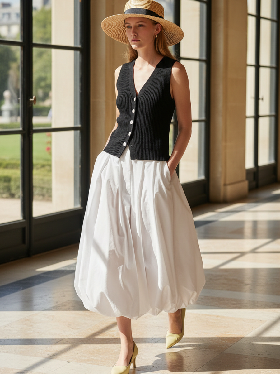 The Women's Elegant Old-money Style Knitted Vest and Pure Cotton Bubble Skirt Set is a harmonious blend of classic sophistication and modern artistry. This set captures the essence of timeless elegance with its refined design and high-quality materials.