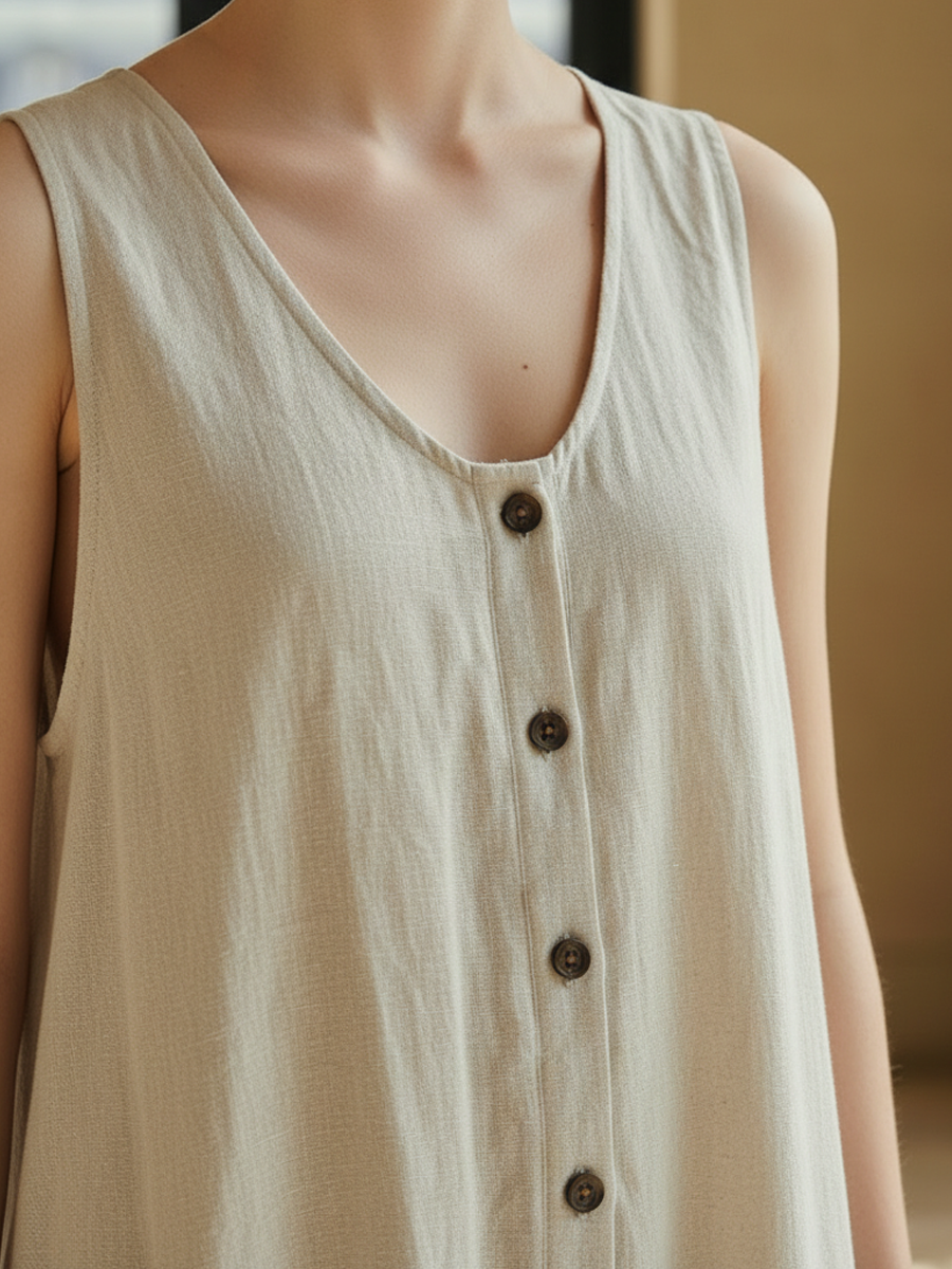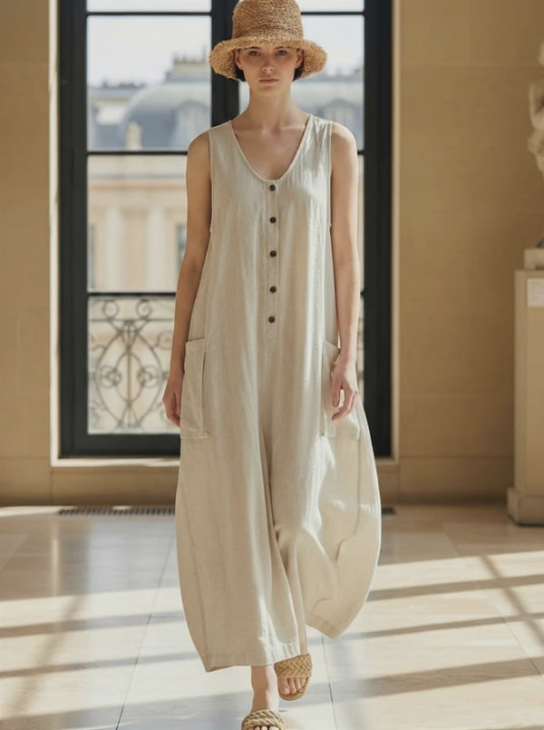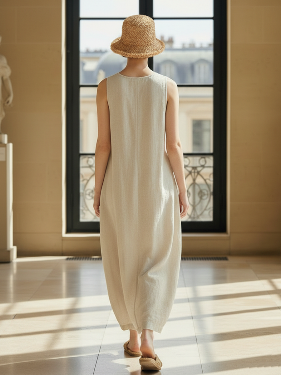 This elegant maxi dress exudes timeless French style, crafted from a luxurious blend of cotton and linen. The dress features a flattering V-neck design, offering a sophisticated yet relaxed aesthetic, perfect for various occasions.
