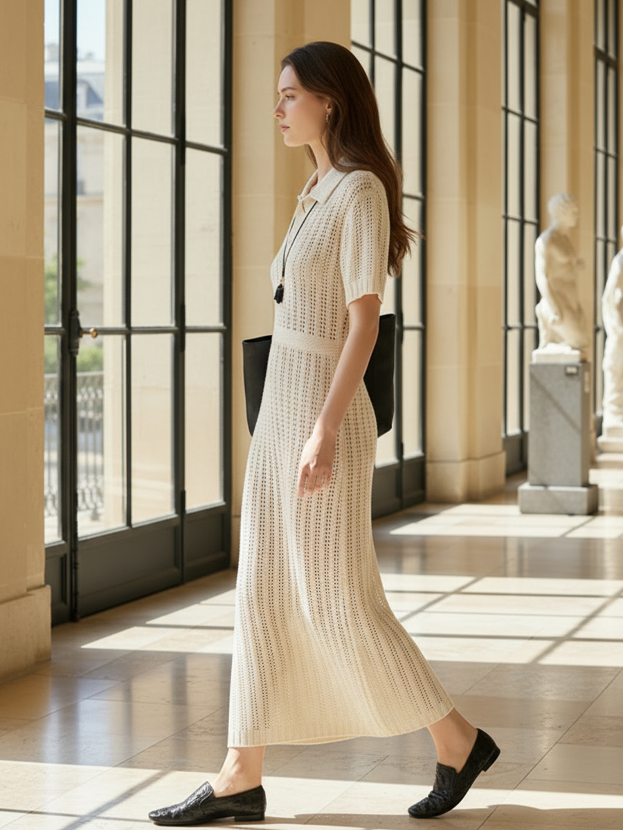 This elegant maxi dress perfectly combines French style with modern comfort. Constructed with a unique polo collar, it radiates a chic and sophisticated look. The dress is crafted from a high-quality knit fabric, ensuring an effortless fit and an exceptional drape that accentuates the silhouette. Its short sleeves add a touch of casual elegance, making it ideal for various occasions.