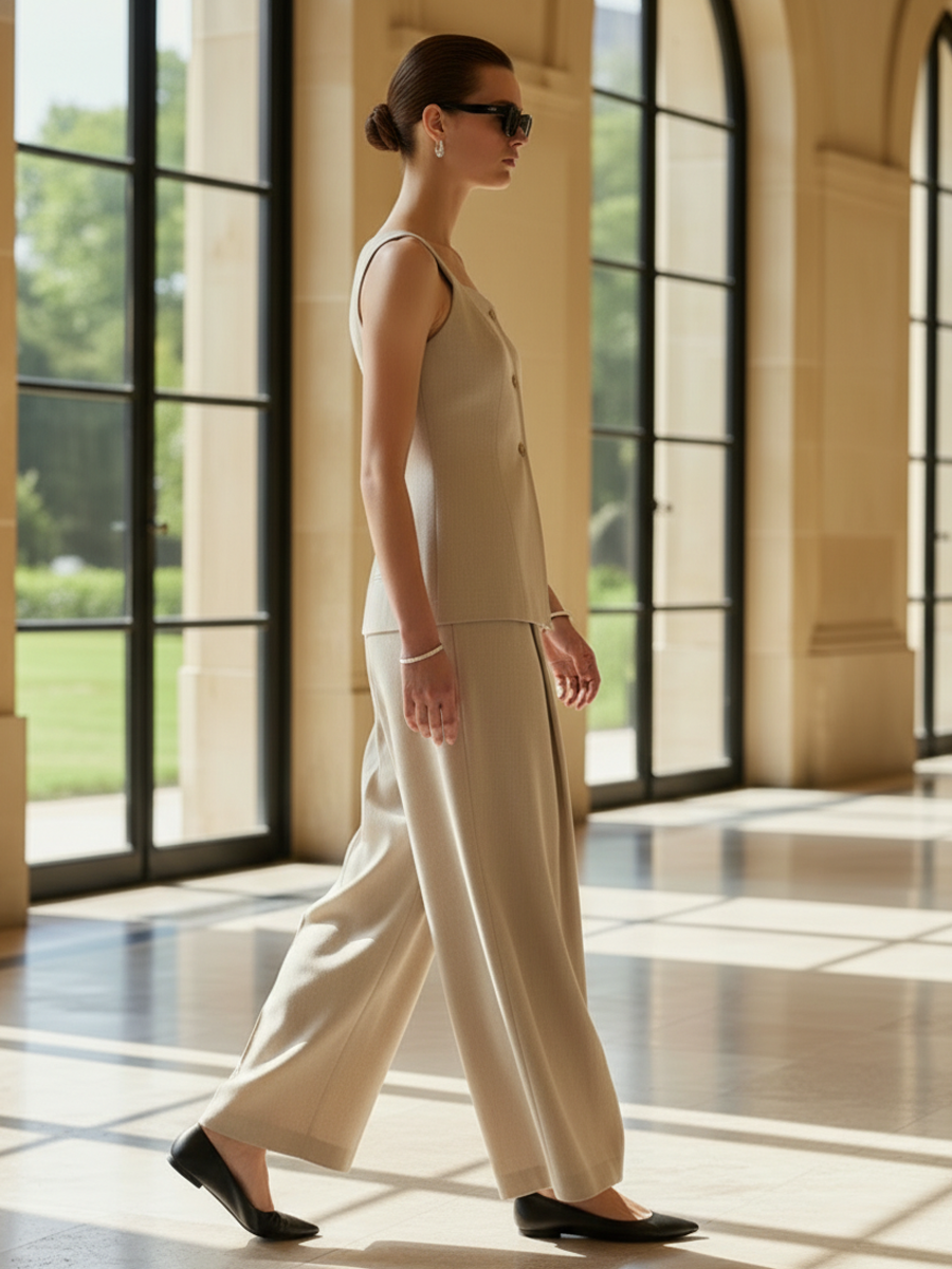A refined two-piece set designed for the modern commuter who favors timeless, understated luxury. This cotton-blend ensemble pairs a tailored sleeveless vest with high-waisted straight trousers to create a balanced, polished silhouette. Neutral tones and clean lines give it the "old-money" aesthetic—classic, versatile and quietly elegant—perfect for office days and smart-casual outings.