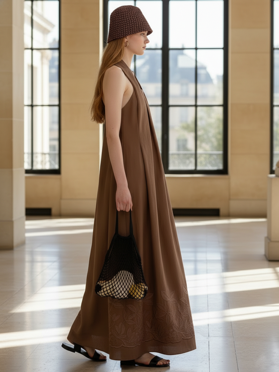 This sleeveless, pure-cotton dress embodies a refined "old-money" aesthetic—quiet luxury with clean lines and delicate detailing. The design features tasteful embroidery on the front bodice and along the hem, creating a subtle focal point that elevates a minimalist silhouette. Tailored to flatter while remaining comfortable, this dress is ideal for daytime social events, garden parties, or an elegant casual office look.