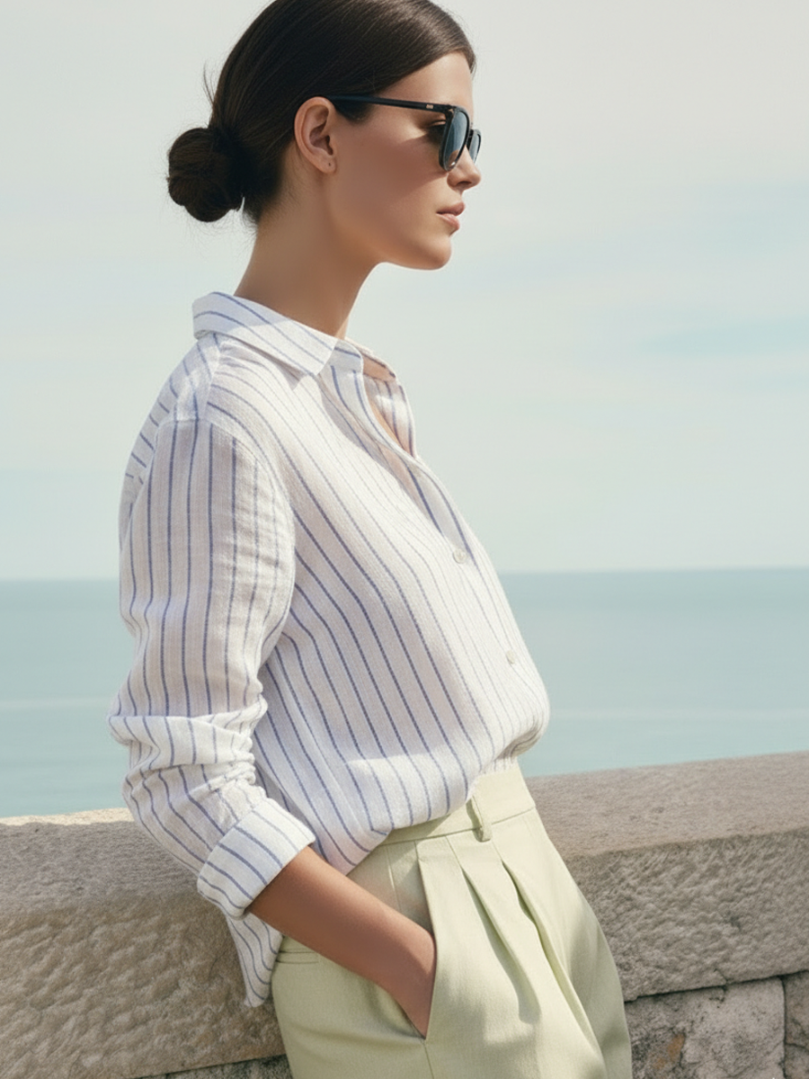 Women's Italian-style Romantic Cotton And Linen Striped Long-sleeved Shirt ZMZ3052A6K