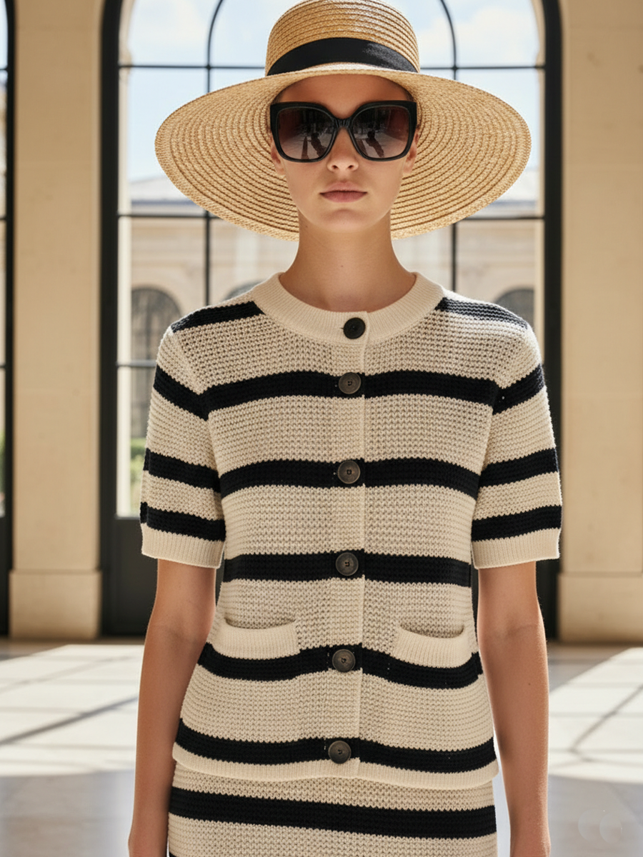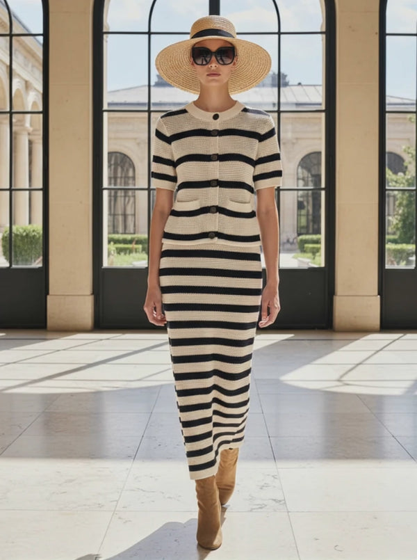 The Women's Italian-style Romantic Knitted Short-sleeved Cardigan And Skirt Set  is a sophisticated and elegant ensemble that captures the timeless charm of Italian fashion. This set includes a delicately knitted short-sleeved cardigan and a matching skirt, offering a blend of classic style and modern comfort. The knitted texture adds a subtle richness to the design, making it perfect for a variety of occasions.