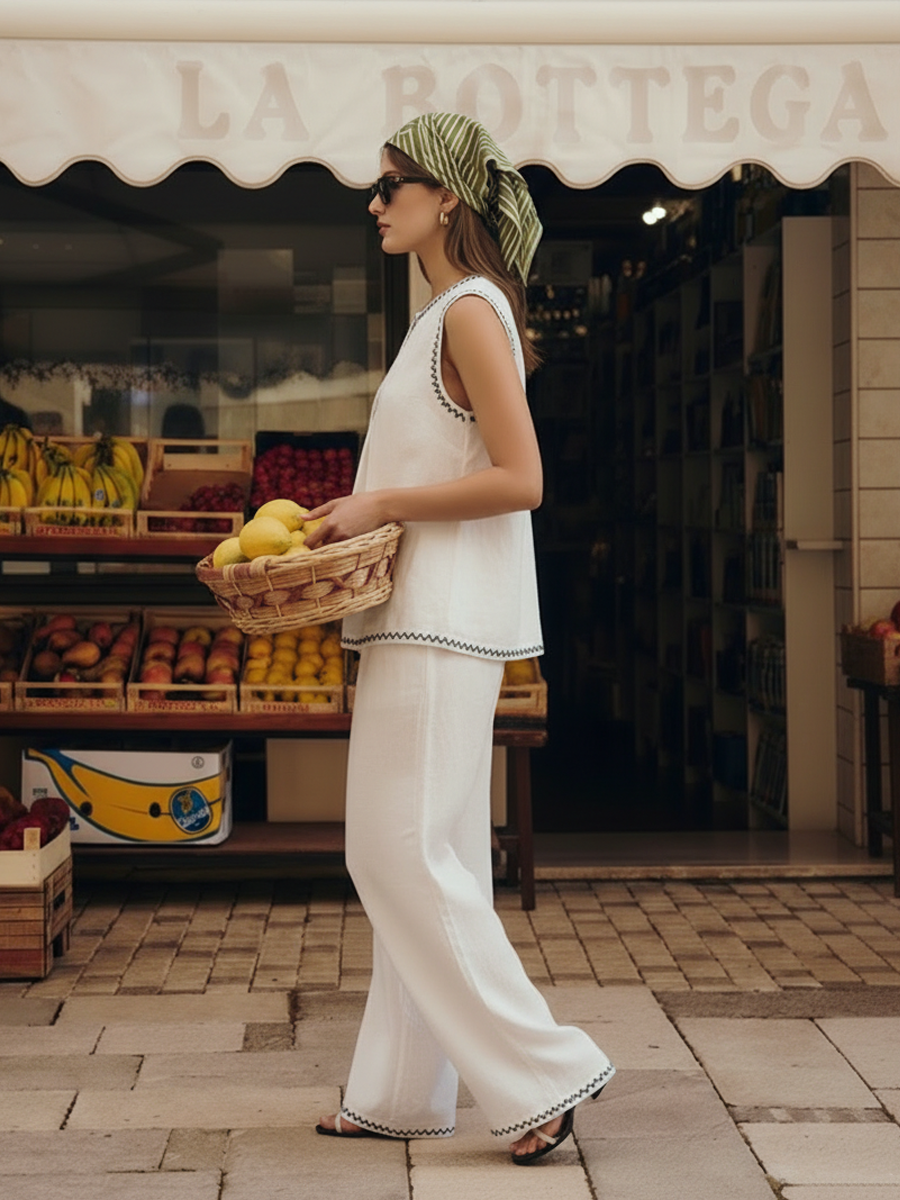 Women's Italian-style Romantic Vacation Embroidered Linen Blend T-Shirt And Pants Set ZMZ3096A0K