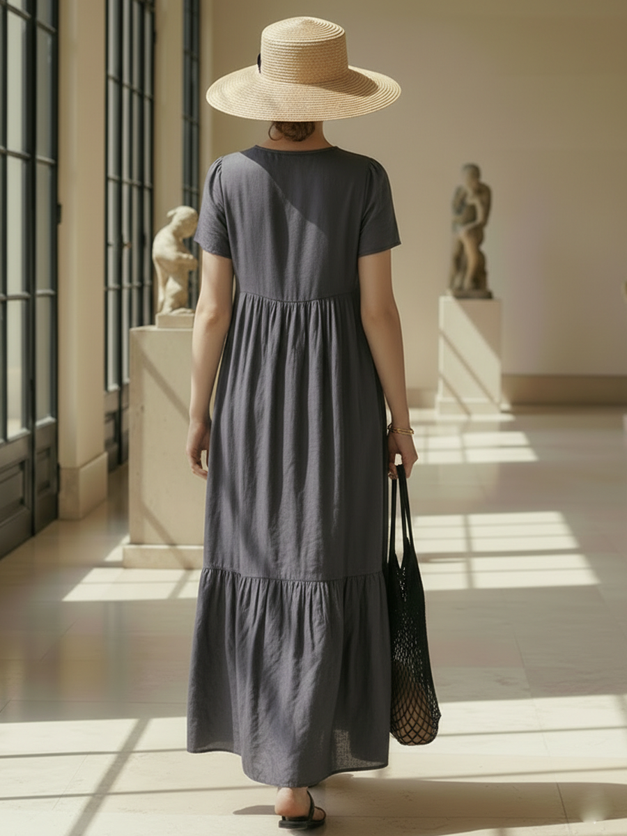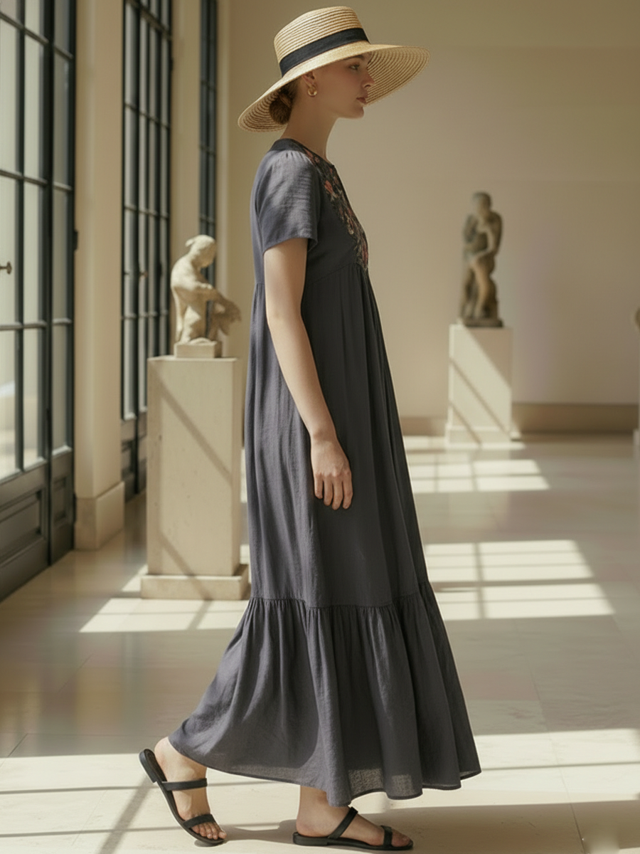 Product Name:Women's Minimalist Embroidered Cotton-linen Blend V-neck Short-sleeved Maxi Dress