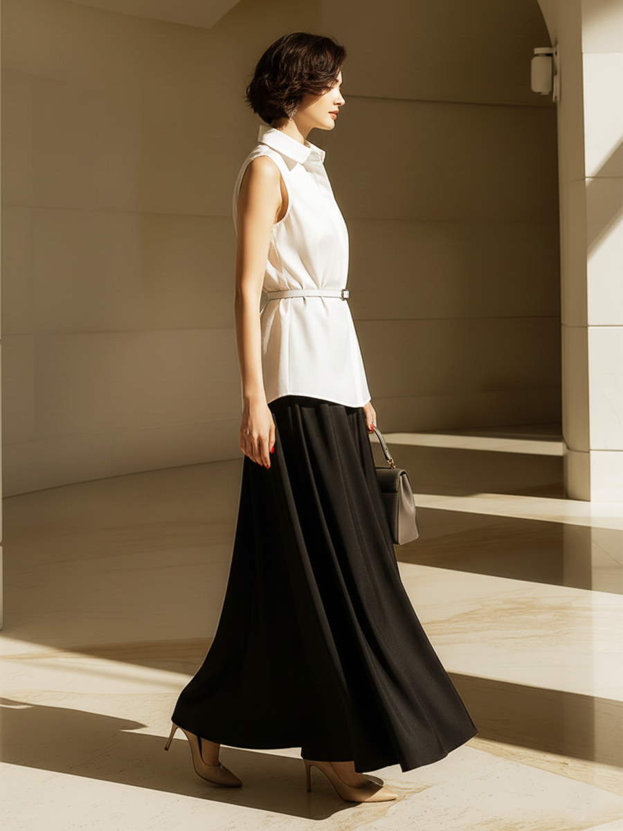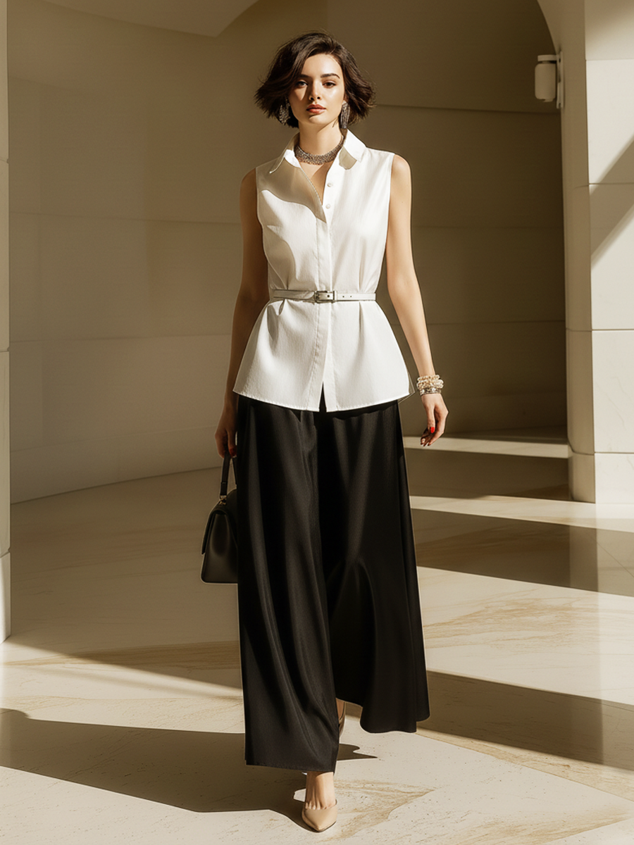 Women's Old Money Style Cotton Sleeveless Shirt (with Belt) And Satin Skirt Set ZMZ2656B5U