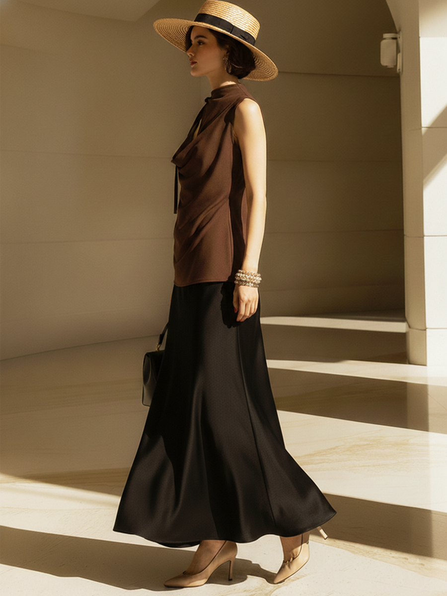 Women's Old Money Style Commuter Tie-Up T-Shirt And Satin Skirt Set ZMZ2791B6U