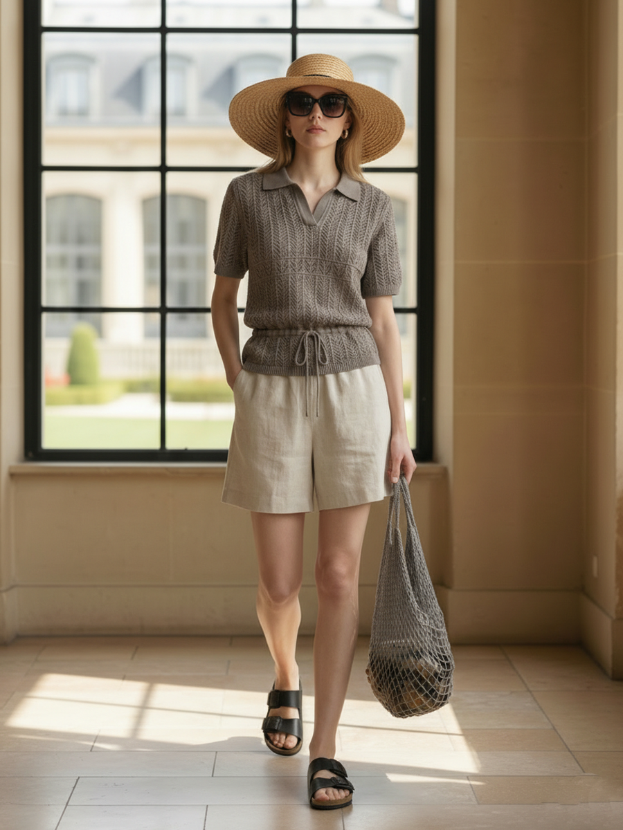 Product Name:Women's Premium Old Money Style Knitted Short-sleeved Polo Shirt And Cotton-linen Blend Shorts Set